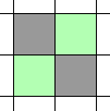Rovnaké malomiestové požiadavky platia aj v tejto úlohe. Nezabúdajte, že všetky nezafarbené polia musia byť „súvislé s okrajom“. Toto zároveň znamená, že nemôže vzniknúť nasledujúca „šachovnicová“ konfigurácia, ktorej zelené políčka sú „vonkajšok“ (prečo?):